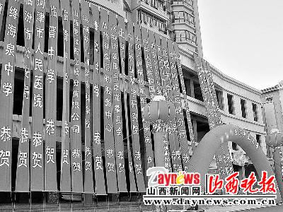 這家保潔公司位于運(yùn)城市區(qū)紅旗東街。當(dāng)日上午,記者在此經(jīng)過時,這里已搭起來彩虹門,上面寫著“×××公司喬遷之喜”,彩虹門的兩邊是掛著對聯(lián)的一對氣球。后面的大廈墻面上掛滿祝賀條幅,有三十條左右。祝賀單位有臨汾市公安局、運(yùn)城市發(fā)改委等機(jī)關(guān)和事業(yè)單位,另外還有中華人民共和國交通部辦公廳、中國林業(yè)科學(xué)院等單位。
