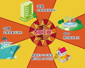 “太陽(yáng)”工程主要包括建20艘五星級(jí)豪華游輪,30家五星級(jí)旅游飯店以及40個(gè)精品旅游景區(qū)等內(nèi)容。工程有望在2012年實(shí)現(xiàn),累計(jì)投入1067億元。
