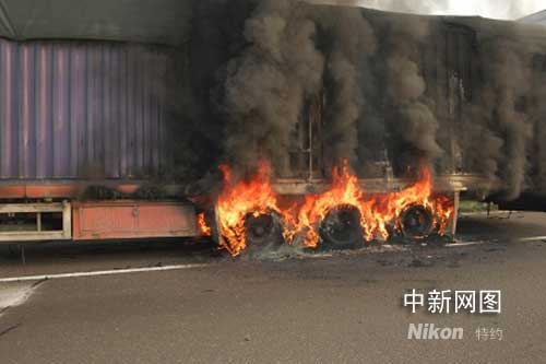 當(dāng)天早晨6時(shí)許,一輛車牌為冀AF3978(掛車牌照為冀AZ747)的大貨車在京珠高速臨長路段由北往南50公里處行駛時(shí),車輛右后胎因?yàn)槟Σ镣蝗黄鸹。隨后,車上裝載的雞蛋的紙盒也很快燃燒起來,駕駛?cè)笋R上報(bào)警。