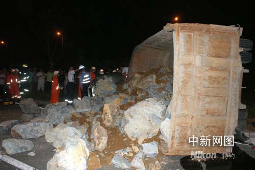 在事故現(xiàn)場,記者看到一輛滿載石頭的工程車側(cè)翻壓在一輛面包車上,地面撒滿了玻璃碎片和石頭,面包車嚴(yán)重變形,2名人員被困,其中一名女子經(jīng)現(xiàn)場救護(hù)人員診斷稱由于失血過多已死亡,另一名被困人員被壓在了工程車下面,不能動彈,生命垂危。