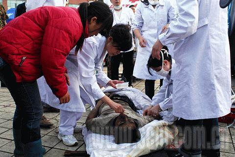 東汽體育館旁邊有一個小學(xué)和一個高中,數(shù)百名學(xué)生遇難。直到下午5點多,體育館前的空地上仍有二十來具尸體被等待運走。