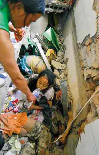 在這里,一名親見(jiàn)女兒身體卻拉不出來(lái)的母親在哭泣,記者見(jiàn)證了一個(gè)震撼人心的場(chǎng)面:一、二層間還存在一個(gè)不到一米的夾層,一名穿綠衣的高中女孩已經(jīng)爬出,返身去拉那名也已大半個(gè)身子爬了出來(lái)的那名母親的女兒,此時(shí)夾層房梁塌下來(lái),二名女孩保持著返身救人和伸手待救的姿態(tài),被砸在了主梁下面,她們離生其實(shí)只差半步之遙。
