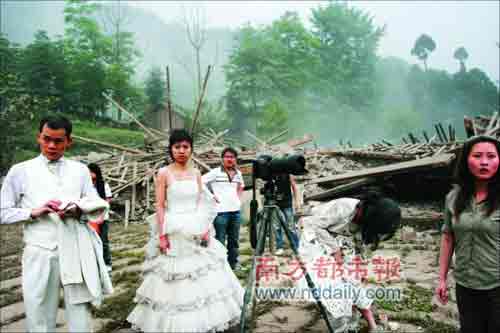 昨天,拍照的攝影師和照片中的新娘接受了本報(bào)記者的電話采訪。新娘的家人都在震中的汶川縣臥龍鎮(zhèn),至今沒有任何消息。