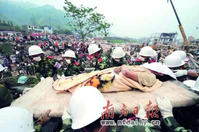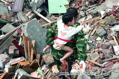 “我一定要找到家里人,死也要死到一起!痹诰d陽市開出租車司機(jī)胡女士說。出事后,她開車前往北川找她的愛人。當(dāng)天下午5點多,她趕到時小縣城已面目全非。胡女士徒步來到愛人上班的新城區(qū),在廢墟上大聲叫著丈夫的名字。終于,丈夫有了回應(yīng):“我在這里,背上有塊大石頭!”胡女士蹲下來說:“不要怕,很快有人來救我們了!睘榱俗寪廴瞬灰驗榭只藕褪а^多昏睡過去,胡女士跪在地上和愛人談起往事,不斷鼓勵、安慰他。半小時后,巡邏人員發(fā)現(xiàn)他們,胡的愛人獲救。而胡女士本人,則因為長時間跪在一塊碎玻璃上,被割掉一大塊肉。(作者:記者胡亞柱張蜀梅)