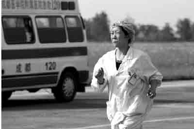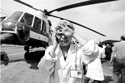 昨天下午4點(diǎn)05分,東方通用航空公司的一架米1-71直升機(jī)緩緩降落在廣漢機(jī)場(chǎng)停機(jī)坪上。艙門打開(kāi),40歲的女護(hù)士杜娟下了飛機(jī),招呼著成都120急救中心的醫(yī)護(hù)人員將傷員抬到急救車上。杜娟是北川縣禹里羌族鄉(xiāng)衛(wèi)生院的護(hù)士。5·12地震后,禹里與世隔絕,直到昨天才等到直升機(jī)將重傷者送出。杜娟隨機(jī)照顧患者。傷員都下了飛機(jī)后,杜娟向于波借手機(jī),電話打通時(shí),她手開(kāi)始顫抖,撕心裂肺的哭聲終于無(wú)法忍住。那是她六天后,第一次給外面的親人打電話。巨大的螺旋槳轉(zhuǎn)動(dòng)聲中,人們只能依稀聽(tīng)到她的哭訴:“我要去找他,不能連個(gè)尸體都沒(méi)有!庇诓乜粗坏揭粋(gè)小時(shí)前,他還覺(jué)得這個(gè)女護(hù)士嚴(yán)厲得有點(diǎn)過(guò)分。