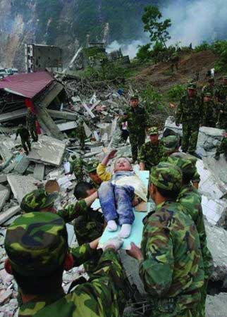 在地震發(fā)生十余小時(shí)后,一位滿臉是血的北川男孩從廢墟中被救出。就在武警官兵準(zhǔn)備把他轉(zhuǎn)移到安全地帶時(shí),他艱難地舉起還能動(dòng)彈的右手,虛弱而又標(biāo)準(zhǔn)地敬了一個(gè)少先隊(duì)隊(duì)禮。擔(dān)架上的小男孩不忘向援救他的官兵叔叔敬禮感恩的舉動(dòng),讓無數(shù)的人深受感動(dòng)。
