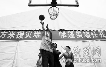籃球場(chǎng)還有一個(gè)籃球架和五分之一個(gè)場(chǎng)地空著。傍晚7時(shí),14歲的北川縣漩坪中學(xué)初一學(xué)生張俊林,和幾個(gè)伙伴一起打起籃球。他說(shuō),他的家毀了,但沒(méi)有人受傷,他現(xiàn)在一家5個(gè)人與其他三家人一起住在一個(gè)大帳篷里,他現(xiàn)在最盼望的是快點(diǎn)回到真正的教室上課。(特派記者 韋忠南 張泉 陳世昌)