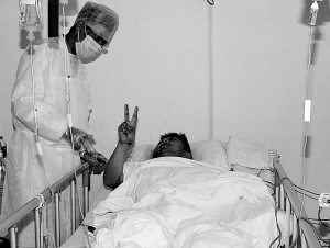 昨日清晨7點,經過手術后的短時間恢復,護士為馬元江送來了他獲救后的第一餐稀飯,護士小心翼翼地將50毫升的粥慢慢地喂他喝下。到了中午12點和下午3點,又分別喂他喝下了各50毫升的營養(yǎng)液。昨日下午6點,馬元江看到醫(yī)生和記者在隔離區(qū)探望時,忽然做出了一個勝利的手勢,讓在場的人非常感動。