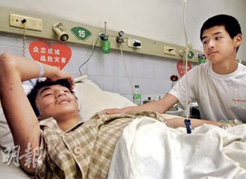 不過,醫(yī)院工作人員表示,廖波的傷口有感染征狀,可能需要再動(dòng)手術(shù),他也經(jīng)常做噩夢而驚醒,一次次回到地震當(dāng)天的情景,想起遇難的同學(xué)就會流淚。見此情況,李陽想多陪廖波幾天,在醫(yī)院亦有北川中學(xué)的老師,答應(yīng)照顧李陽的衣食住行,并會在他復(fù)課前帶他返校。