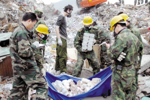 在長達6天的搜救過程中,北川縣日益成為危城。官兵們將資金、食品急送至鄰近的謝家坪村,那里有36戶受災群眾;18日,他們將大量群眾轉移至安全地帶……同時,他們冒著余震不斷、堰塞湖隨時可能決堤的危險晝夜作業(yè),先后3次緊急修改搜救方案,共救出9名幸存者,并于21日傍晚成功挖出金庫庫款。官兵們將廢墟中散碎的人民幣逐一收撿入兩個大袋子,5個存放大量現(xiàn)金的保險柜也被逐一發(fā)掘出來——18時20分,第一批資金被清點出來;19時20分,搜救工作結束,北川信用聯(lián)社620余萬元資金完好無損(如圖)!官兵們繼續(xù)搜尋,包括記錄資金信息的筆記本電腦、憑證等均被搶救出來。