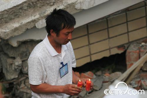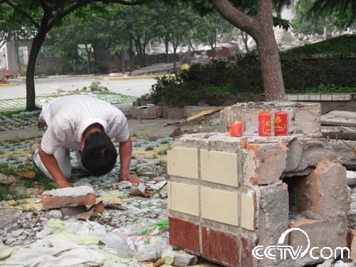 “孩子們,沒有全部救出你們我很內(nèi)疚,我會記住你們忌日的,每年的這一天我都會來看你們,給你們送學習用品。你們生前都很團結(jié),在天堂也要相互關(guān)照好,老師每天都在想念著你們!”在北川中學(新區(qū))的廢墟下,記者看到一名中年男子跪在地上,哭得很悲傷,還向遇難的同學叩拜。記者跑過去一看,此人就是北川中學的校長劉亞春。他告訴記者,地震后他一直在忙碌搶救學生的事,沒有時間來看望這些還埋在廢墟下的數(shù)百名學生。今天他在百忙之中,抽時間來看看這些孩子們,他將帶來的蠟燭點燃后放在廢墟下,雙手合十,默默地祈禱,然后跪在地上給在地震中失去生命的學生磕了三個響頭。