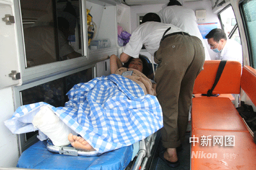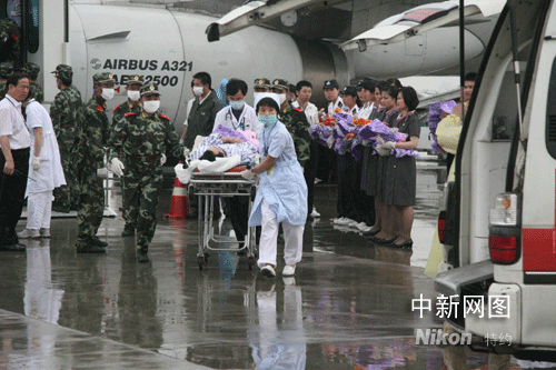 十一點左右,傷員一個個被武警官兵抬出飛機,并送上等候在停機坪上的三十六輛救護(hù)車,并被迅速送往浙江金華三家最好的醫(yī)院接受治療。