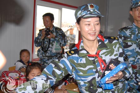 海軍少將宋祖英赴四川綿竹和小學(xué)生過兒童節(jié)(圖)