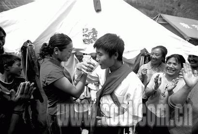 “親一個(gè),親一個(gè)!”在滔滔的岷江邊,在凌亂的廢墟旁,在簡單的帳篷里,這樣的聲音對遭遇特大地震災(zāi)害后的汶川而言,顯得久違而珍貴。正是在這個(gè)重災(zāi)區(qū),在鄉(xiāng)親們熱情的呼喊中,昨日上午,汶川縣威州鎮(zhèn)雙河村的一對年輕羌族戀人攜手走進(jìn)婚姻殿堂,為這個(gè)劫后重生的地方增添了一些喜氣。