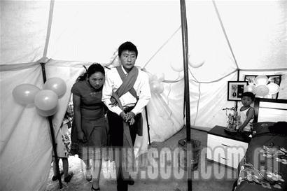 既然要結(jié)婚,就應(yīng)有一頂帳篷作洞房。王小波所在雙河村黃巖組的干部5月31日趕緊去找?guī)づ瘛5襾碚胰,最后只找到一頂白色帳篷?/p>