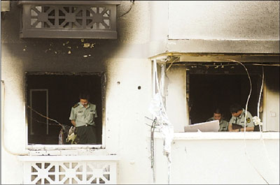 事發(fā)房間損毀嚴(yán)重,消防員在勘察現(xiàn)場(chǎng)。
