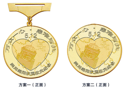 趙琛說,紀(jì)念章有著特殊的表現(xiàn)形式。內(nèi)輪廓為心型,代表全國人民萬眾一心支持綿陽賑災(zāi);外輪廓為圓形,象征太陽。整個紀(jì)念章的正面寓意為“心中太陽升起”,表達(dá)四川綿陽人民重建家園的信心和力量。