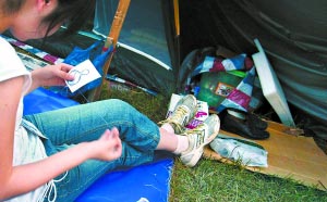 夜里,伴隨著隱約的搓麻聲,居民們平靜地睡去。自唐家山堰塞湖三分之一潰壩應(yīng)急方案啟動的一周以來,綿陽市已經(jīng)有20萬居民撤離到了附近的十多個應(yīng)急安置點(diǎn),綿陽市游仙區(qū)的富樂山公園是所有安置點(diǎn)中最大的一個。來這里的市民基本都是家園完好只是為躲避洪水。到目前為止,已有大約5萬多人在這座山上支起了簡易帳篷。這么多人跑到公園過日子,缺水、少電、如廁難,有關(guān)部門為此也想了不少辦法,放放電影,看看電視,找來流動圖書館豐富市民生活。每天山下有新人上山,不少市民就會跑上去了解一下市里的新情況。