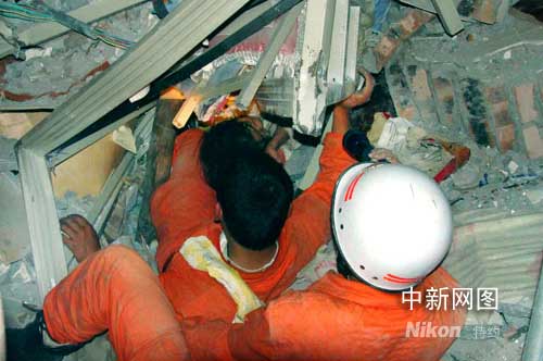 這里還有生命存在!濰坊市公安消防支隊(duì)參加救援的官兵迅速聚集在這片廢墟周圍,小心翼翼的搜尋生命奇跡的存在地。這是映秀灣發(fā)電廠的賓館,6層樓建筑已經(jīng)全部垮塌,電廠賓館廢墟堆高約4米,樓板磚墻層層疊壓,上部樓板隨時(shí)都有再次坍塌的可能。距現(xiàn)場(chǎng)2米的右側(cè),是一座6層高且遙遙欲墜的未倒塌建筑,余震之中樓體搖搖晃晃,不斷有磚石碎塊掉落,整幢建筑岌岌可危。