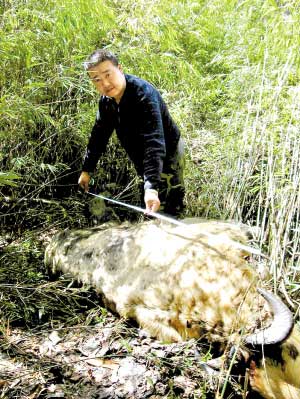 唐家河國家級自然保護區(qū)管理處副處長鮮方海拿出一疊照片說:“僅僅在交通恢復的林區(qū)邊緣地帶,就發(fā)現(xiàn)了國家一級保護動物牛羚死亡了兩頭,都是滑坡被砸死的!庇捎诨聡乐,目前無法進入山林的腹心地帶,他們僅在林區(qū)邊沿地帶搜索動物的行蹤,就發(fā)現(xiàn)了牛羚、金雕、野山羊等至少15具動物的尸體,其中大部分是國家保護類動物。