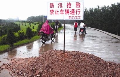 昨日中午,記者在漢江蔡甸永固堤入口處看到,干堤道路已被沙土擋住,豎有一塊“防汛搶險(xiǎn)”的警示牌。前行數(shù)百米,至永固堤中段,可見(jiàn)堤頂?shù)乃嗦访嬗写笃,兩根涵管從堤身穿過(guò)。經(jīng)測(cè)量,塌陷處長(zhǎng)15米,寬8米,最大塌陷深度約0.3米。