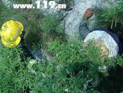 另外一個受傷人員被甩到離公路100米的深溝中,由于地勢復(fù)雜、雜草樹木多救援相當(dāng)困難,經(jīng)過認(rèn)真尋找路徑,終于救生繩索離受傷人員很近了,由于深溝離地面公路太遠,必須先通過一步一步向上抬一段距離才能施救,中隊?wèi)?zhàn)士綁好被救人員艱難的向爬,終于到了安全繩能拉到的距離,但是由于山勢陡峭,灌木比較多,于是戰(zhàn)士們拿出機動鏈鋸,邊抬受傷者邊用機動鏈鋸掃清路上的障礙,受傷者終于被救了上來迅速送往了醫(yī)院。