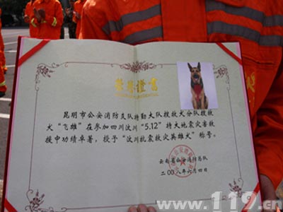 據(jù)中國消防在線消息,儀式上,昆明消防支隊支隊長楊文華介紹了搜救犬分隊赴川抗震救災(zāi)的英勇事跡;云南消防總隊總副總隊長代如田宣讀了《云南省公安消防總隊關(guān)于授予昆明市公安消防支隊銀虎等7條搜救犬汶川抗震救災(zāi)英雄犬稱號的決定》;出席儀式領(lǐng)導(dǎo)為受表彰的搜救犬頒發(fā)了“英雄犬”榮譽證書.