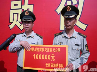 中新網(wǎng)6月12日電 6月6日下午,云南消防總隊在昆明消防訓(xùn)練基地隆重舉行儀式,授予赴川抗震救災(zāi)的“銀虎”、“昆虎”、“小虎”、“金雕”、“菲離”、“威嚴”、“飛雄”7條搜救犬“汶川抗震救災(zāi)英雄犬”稱號。云南消防總隊總隊長王子崗向受表彰的英雄犬頒發(fā)了10萬元獎金。