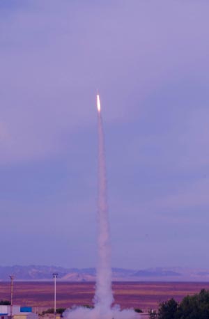 “3,2,1,點(diǎn)火!”昨天上午8時(shí),酒泉衛(wèi)星發(fā)射中心。一聲令下,北京航空航天大學(xué)宇航學(xué)院學(xué)生王虹玥沉著地按下了電子點(diǎn)火按鈕。“嘭”的一聲,“北航一號(hào)B”火箭尾部瞬時(shí)噴出一股耀眼的火焰,箭體呼嘯而出,留下一道白煙直刺入萬米高空,在廣袤的西部沙漠中,伴隨著一輪噴薄而出的紅日,鐫刻成一幅完美的畫面。