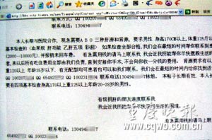前天下午,記者在天涯網(wǎng)一則求捐肝源的帖子上看到一則跟帖:“本人長期與醫(yī)院合作,現(xiàn)急需要A、B、O三種肝源和腎源,要求男性……”發(fā)帖的是一個名叫“真實可靠”的網(wǎng)友,帖上留有3個QQ號和1個手機號碼。昨日下午3時20分,記者撥打了這個手機。
