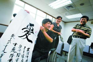 記者了解到,吳華林?jǐn)嗤惹霸诒本⿵氖路b生意。斷腿后,他無法再從事任何工作,于是開始用練字來打發(fā)時(shí)間!拔乙郧皬臎]練過毛筆字,這兩年才開始練,你看,這是我寫的‘愛’字!眳侨A林邊說,邊從放在輪椅上的包內(nèi)拿出一幅字讓記者看。目前,吳華林在北京街頭以賣字為生,每幅字讓購買者隨意出錢,“有的給5塊錢,有的給10塊或20塊”。聽完終審判決后,他還專門把寫有“謝謝”的一幅字送給法官。