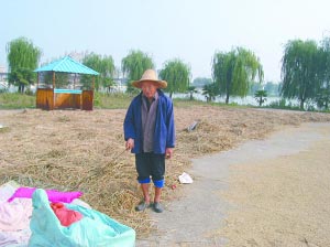 夏天,老百姓在公園內(nèi)的水泥地上曬糧食。