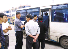 通知發(fā)出的第3天,進入茅山集鎮(zhèn)的路口突然出現(xiàn)手持警棍的12名執(zhí)法隊員,他們一字排開,將路口封死,嚇得客車連忙下客,將乘客丟在雨中,匆匆回頭。第4天,司機們索性將車停在離集鎮(zhèn)入口100米的“高璟超市“門前,但執(zhí)法隊仍然進行驅(qū)趕,無奈客車只好再退3.5公里,停在茶場一隊。見車主還是不交“保證金”,執(zhí)法隊繼續(xù)干預(yù),將客車又逼退1.5公里左右,停在茶場二隊。此地已經(jīng)距離茅山6公里左右,到了后白鎮(zhèn)境內(nèi)。但心有余悸的司機還是不放心,又向后退出1公里,索性停在茅西小鎮(zhèn)上。