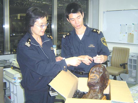 有一次,廣州海關(guān)在一件工藝品中查獲毒品,該工藝品呈圓盤狀,是用樹(shù)脂材料制成的頭像,整個(gè)工藝品渾然一體,毒品都藏匿其中,表面沒(méi)有一絲破綻,并且在圓盤的周邊都沒(méi)有藏匿毒品,所有的毒品都藏匿在頭像面部的突起部位。(記者蔡巖紅)