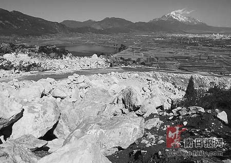 站在麗江城區(qū)的高樓之上,向玉龍新城區(qū)與文筆海遠(yuǎn)眺,首先看到的便是文筆山青山綠水間面山的傷痛。遠(yuǎn)看似乎是一個(gè)采石場(chǎng),走近才看清是一條盤旋的道路。