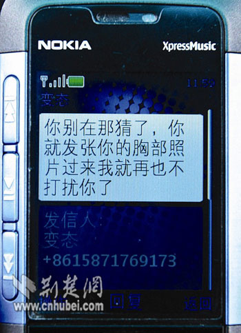 “你只要把胸部照片發(fā)過來,我就罷手。”昨日,收到對(duì)方提出的無理要求,漢口女士小霞(化名)精神幾乎崩潰。近半個(gè)月來,這樣的下流電話和短信每天都在折磨著她。