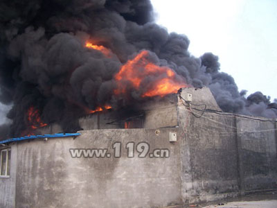 到達(dá)火災(zāi)現(xiàn)場后,經(jīng)過指揮員火情偵察,發(fā)現(xiàn)發(fā)生火災(zāi)的為一座儲(chǔ)存油漆等化工危險(xiǎn)品的簡易倉庫,火勢處于迅猛發(fā)展階段,并迅速向東面相鄰的山東電視臺(tái)存放布景道具的倉庫蔓延(里面存放著價(jià)值50萬元左右物資),情況十分危急,中隊(duì)指揮員立即兵分兩路,15噸水罐車出單干線兩槍操,一支槍在南側(cè)倉庫上方壓制化工品倉庫內(nèi)部火勢,另一支槍控制住正向東蔓延的火勢,防止引起更大面積的火災(zāi)。中隊(duì)斯太爾泡沫水罐于物資倉庫北側(cè),出單干線一支槍壓制火勢防止火勢向北側(cè)民用房蔓延。