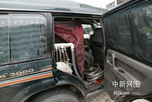 記者今日在佛山市張槎派出所內(nèi)看到,“油耗子”將吉普車(chē)改裝成的油罐車(chē)內(nèi)“裝備”齊全,車(chē)輛側(cè)窗和尾窗玻璃用布簾遮得嚴(yán)嚴(yán)實(shí)實(shí),根本看不到車(chē)內(nèi)的情形。