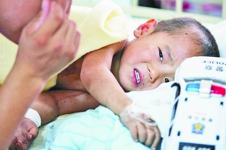 昨日上午10時20分,在鄭州市兒童醫(yī)院住院部外一科病房,記者見到了這個正在側(cè)身熟睡的男孩邢錦祥。此時,小錦祥正在輸液,他的右臂、后背等部位有傷,包著紗布。