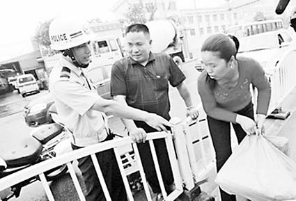 交警正制止行人翻越護欄。陳飛攝