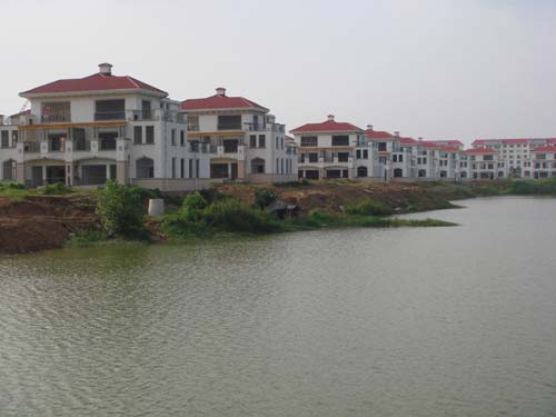 7月28日下午,記者在“政和花園”小區(qū)看到了一個30多畝的人工湖,湖畔綠樹婆娑。環(huán)湖而立的是一座座紅頂黃墻的別墅,每幢別墅三層。別墅之間互相獨立,依次排列。