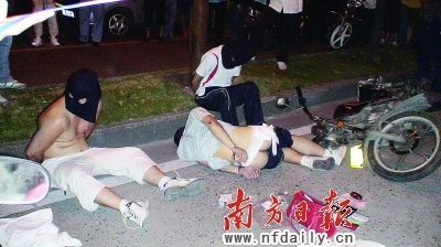 當(dāng)晚,記者趕到現(xiàn)場看到,其中一名搶匪側(cè)躺在地上,屁股部位稍稍露出,醫(yī)院護(hù)士已對他的傷口進(jìn)行了包扎。醫(yī)生表示,已為搶匪做了臨時(shí)包扎,目前其沒有生命危險(xiǎn)。另外兩名搶匪則坐在地上,現(xiàn)場還有一輛翻倒的摩托車和一個(gè)女式手提袋。