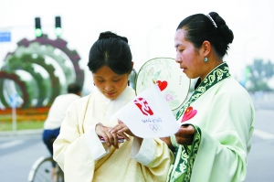 她的同伴,北京聯(lián)合大學(xué)大二的學(xué)生吳佳嫻,手上印有北京奧運(yùn)的徽章,漢服上貼有心形國旗圖樣。她和豐茂華是“漢網(wǎng)”(漢服愛好者交流的網(wǎng)站)的網(wǎng)友。二人穿著的漢服是到專門服裝店訂做的。