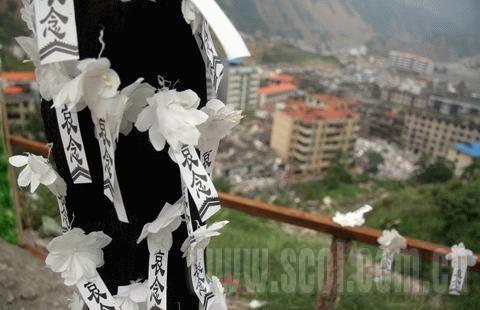 在一個(gè)被當(dāng)?shù)厝朔Q為“三倒拐”的地方,鐵血四十師在此拉起了一方橫幅:沉痛悼念北川遇難同胞。橫幅下面擺放著一個(gè)大的花圈,花圈兩邊分別是假花拼成的“5·12”和“北川”字樣。橫幅下的欄桿上,密密麻麻貼著寫有“哀悼”二字的小紙條,每一個(gè)紙條,代表著一個(gè)亡靈。
