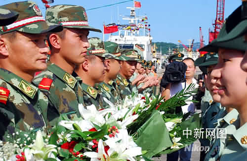 10名戰(zhàn)友上前向執(zhí)行奧運安保任務(wù)的海警代表獻(xiàn)花