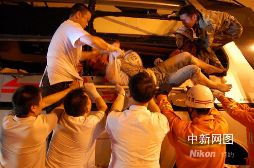 在救援過(guò)程中,消防官兵還不停安慰傷者,救援人員經(jīng)過(guò)將近3個(gè)小時(shí)的艱苦破拆工作,終于將擠壓傷員車體部件一一拆下,將乘客救出。