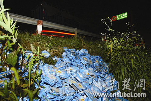 昨晚9時(shí)許,記者趕到現(xiàn)場看到,京廣立交橋離孝感主城區(qū)約1公里左右,是107國道與京廣線的交會(huì)處,奶粉袋位于107國道橋頭的雜草叢中,每5個(gè)空袋用橡皮筋捆為一扎。記者隨手翻開了兩扎,發(fā)現(xiàn)奶粉袋上灰塵不多,袋口均有撕開的痕跡,上面標(biāo)注的生產(chǎn)日期從2006年3月到9月不等,保質(zhì)期為18個(gè)月。