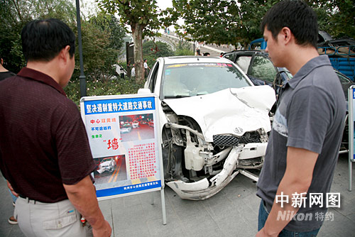 中新網(wǎng)杭州9月21日(見習記者袁爽 通訊員莊琪 張諄 馬進)9月21日上午,在杭州拱宸橋東側(cè)運河文化廣場,3輛已經(jīng)面目全非的機動車被過往的市民圍得嚴嚴實實,交通事故觸目驚心的圖片和活生生的“教材”產(chǎn)生了巨大的震撼力。 上午9 時,“堅決遏制重特大道路交通事故百日安全競賽”在杭州運河西廣場舉行宣傳啟動儀式。