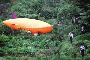 25日下午3點(diǎn),岷山昆明制藥廠內(nèi),一“不明飛行物”突然闖入,降落在半山腰上,周圍近百住戶上山圍觀,一些人以為是UFO,數(shù)輛警車載著近30名警察趕到現(xiàn)場。其實(shí),“不明飛行物”只是一艘普通的飛艇,是某航模公司與某火電廠架設(shè)高空電線用的,因為下雨,遙控器失靈,發(fā)動機(jī)停止工作,最后落了下來。(據(jù)都市時報)
