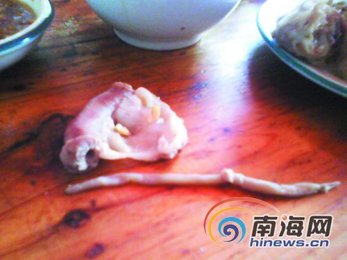 大家吃了一陣后,同桌的一位女士又加了份粉腸。而當(dāng)大家準(zhǔn)備動(dòng)筷進(jìn)吃粉腸時(shí),突然發(fā)現(xiàn)其中一截粉腸兩端竟然露出異物,用筷子夾出來一看,竟然是條長約9厘米的寄生蟲。大家當(dāng)時(shí)都惡心不已,其中一位女士更是跑到一邊嘔吐不止。